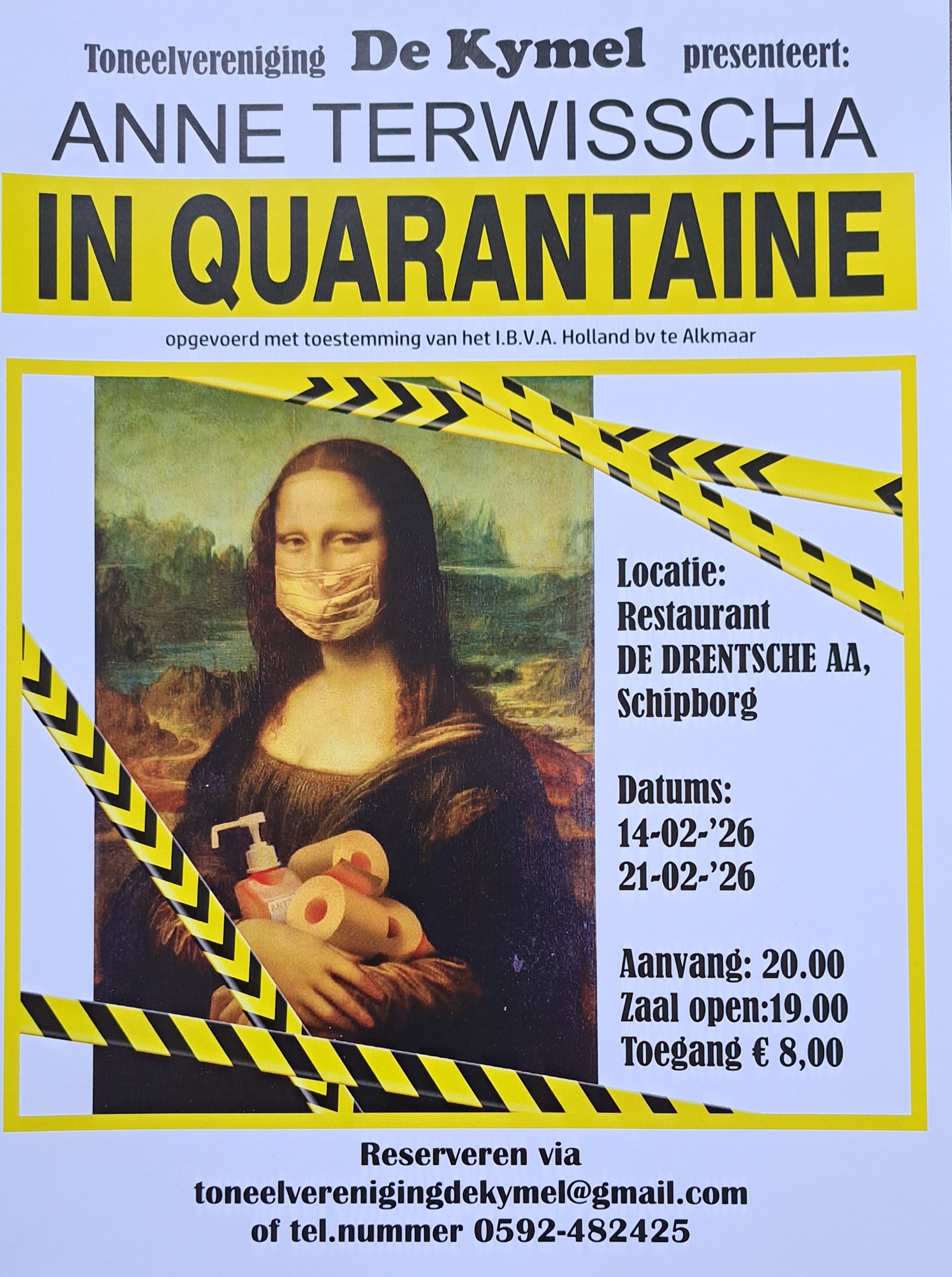 De Kymel speelt deze avonden het blijspel “In Quarantaine”. Dit stuk, geschreven door Anne Terwisscha, is een blijspel in drie bedrijven en speelt zich af in de hal van een museum ergens hier in Nederland. Museumdirecteur Frans kampt met te weinig bezoekers en zou graag willen dat er meer bezoekers naar zijn museum komen. Dan breekt plotseling de besmettelijke ziekte “de pepperitis” uit. Iedereen moet daardoor drie dagen in “quarantaine”. Maar hier zitten een aantal bezoekers helemaal niet op te wachten.